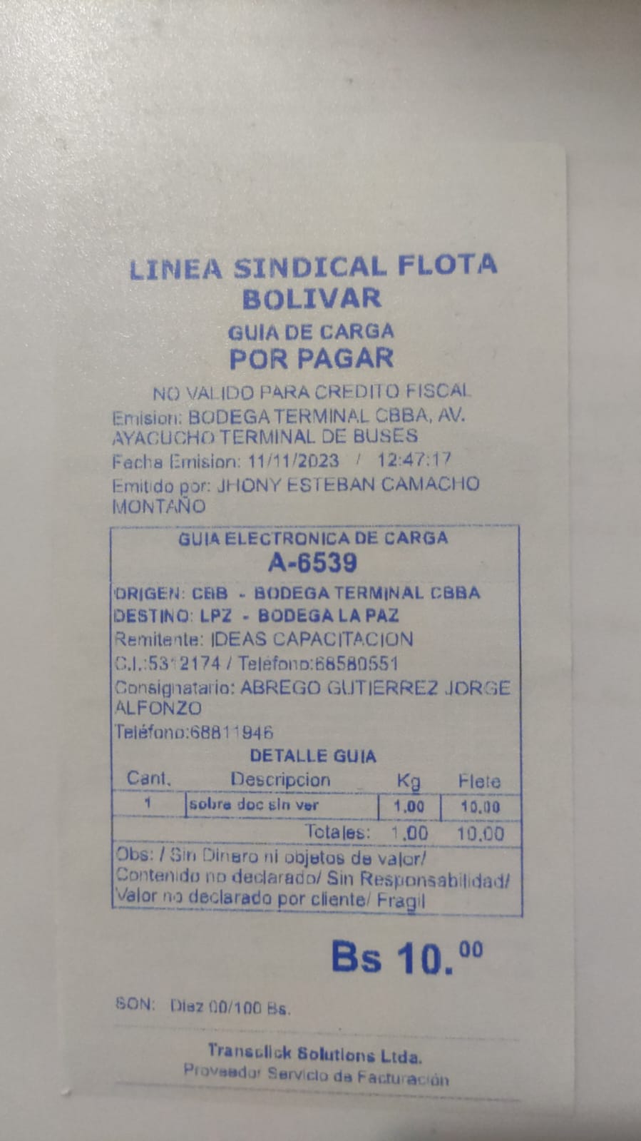 Transportadora: FLOTA BOLIVAR.
