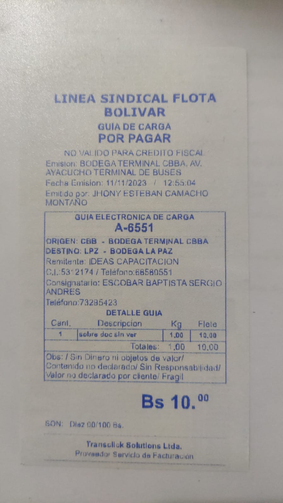 Transportadora: FLOTA BOLIVAR.