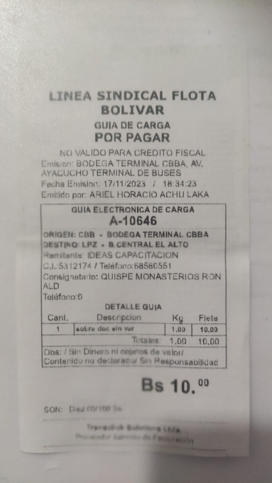 Transportadora: FLOTA BOLIVAR.